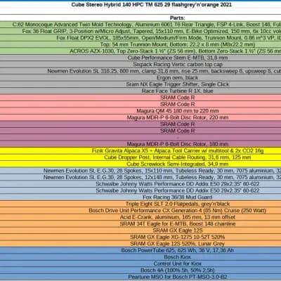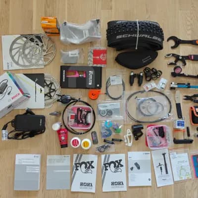 Myydään Cube Stereo Hybrid 140 HPC TM 625 täysjousitettu sähköpyörä. Mukaan myös varaosia, tarvikkeita ja työkaluja. Tästä oiva aloituspakkaus kevääseen! Pyörällä tuli aikanaan ajettua paljon ja säälimättä, nyt se on jäänyt varastoon makaamaan ja joutaisi jo uuteen kotiin. Ajettu kaikkea polkuajosta bike park hissipyöräilyyn - hypitty ja ajettu droppeja. Käytön jälkiä löytyy paljon, mutta ei silti mistään rikki. Pyörällä ajettu ihan surutta, mutta yleensä myös pesty hyvin, ketjut ja liukuputket voideltu ja pyörä säilytetty lämpimässä. Voimansiirron uusimisen jälkeen ei ole enää eksytty bike parkkiin ja meno ollut rauhallisempaa. Kaikki toimii, testilenkki ajettu juuri ja pyörä pesty. Pyörälle ei kilometrejä enää kerry, eli ostajaa odottelisi. Perustiedot: -Vuosimalli 2021. Ostettu XXL.fi verkkokaupasta 09.04.2021. Olen ensimmäinen omistaja. -Runkokoko M 18”. Rengaskoko 29". Joustomatka edessä 150mm, takana 140mm. -Bosch Gen 4 moottori, Bosch Kiox System, Bosch PowerTube 625 akku, Bosch 4A laturi -Mittarilukema nyt 5620km. -Peartune 3.0 lastu (rajoituksenohitin) asennettu 4600km mittarilukemalla. Aktivoidaan Walk-assist painikkeesta, jonka jälkeen huippunopeutta ei ole rajoitettu, mutta nopeus- ja matkamittari näyttää oikein. -Koko voimansiirto(eturatas, kasetti, takavaihtaja, ketju) uusittu 4700km mittarilukemalla. -Helposti irroitettava lukollinen akku, helppo ottaa mukaan latausta varten. Lataus mahdollista myös kiinni pyörässä. 2kpl Abus avaimia. -Osia vaihdettu ja päivitetty pyörään sen elinaikana harrastusmielessä paljon. Tämänhetkinen tarkka osalistaus löytyy kuvasta. Lisäksi itse pyörän lisäksi mukaan saa: Uusia käyttämättömiä varaosia: Cube moottorin suojamuovi Cube moottorin suojamuovin etupala Bosch ajovalon kytkentäjohto moottoriin 1400mm Fox Float takajousen tiivistesarja 803-00-142 Fox Fluid x2 Dropperin asennusvaijeri + suojakuori x2 Sram GX 12s ketju + ketjulukko Sram 12s ketjulukko oilslick Sram oliiveja ja pinnejä jarruletkuihin Ergon grippien päätytulppia Tubolito Tubo-MTB 29 sisärengas Continental 29 sisärengas Käytettyjä lisätarvikkeita: Kryptonite Evolution 4 1090 ketjulukko, 3kpl avaimia (ei kuvassa) Abus lukitusvaijeri (ei kuvassa) Fizik satulan alle tuleva monitoimityökalu/CO2 pumppu + 2x CO2 kapselit Schwalbe Ice Spiker Pro 29x2.25 taittuva nastarengas Race Face Chester flattipolkimet, pinkit Sram GX vaihteenvalitsin (n.20km ajettu, uudenveroinen) Sram Centerline 200mm jarrulevy x2 Sram Centerline X 180mm jarrulevy Sram Dot Grease asennusrasva Sram Butter yleisrasva Slick Kick erikoisrasva liukuputkille Dynamic asennustahna hiilikuituosille Jarruadaptereita erilaisia 3kpl Led etuvalo usb-ladattava Tarvikelaukku runkoon Työkaluja: Cyclus Tools Bosch-erikoishylsy "spider" eturattaan irroittamiseen moottorista Bahco monitoimityökalu SuperB mini monitoimityökalu Sram takavaihtajan säätöpala Kasettihylsyjä 2 erilaista Iskaripumppu x2 Ketjupiiska Pinna-avain Jarrujen ilmaussarja Sram-jarruihin Jarrupalojen levitystyökalu Momenttiväännin ruuvauskärjelle Ketjunkatkaisin Ketjunvenymämitta Ketjulukkopihdit