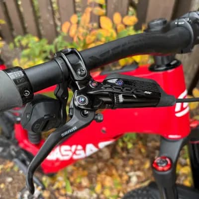 Pikkasen yli 400km ajettu loistokunnossa oleva GASGAS:n MXC6. Mullet rengaistus 29/27,5. Mukana 2 iskaria, Coil ja ilma, Range extender telineellä, jolla vaihdat joko lisäakun, tai juomapullotelineen. Mukaan XL kokoisia GASGAS ajovaatteita… Takuu voimassa 04/27 Runko: Hiilikuitu Keula: DVO Onyx D1CV OTT, Air, 160 mm, tapered (muutettu 170mm, pystyy muuttamaan 160mm) Iskarit: DVO Topaz AIR CV, Air, 205x60 mm (140mm) ja DVO JadeX CV Coil, Coil, 205x65 mm (160mm, Rockshox 500 jousella ja 450 DVO) Kiekot: Edessä 29” NEWMEN Evolution SL E.G. 30, Tubeless ready / Hub: 6-hole, 15x110 mm, thru axle. Takana 27,5 NEWMEN Evolution SL E.G. 35, Tubeless ready / Hub: 6-hole, 12x148 mm, thru axle Renkaat: Edessä Schwalbe Magic Mary 29/2,5. Takana: Schwalbe Tacky Chan 27,5/2.4 (litkutetut) Moottori: SRAM Eagle Powertrain, 250 W, 90 Nm Akku: 630wh + 250wh range extender Kammet: SRAM X0 Eagle E-MTB Vaihtaja: SRAM X0 Eagle Transmission, 12-S AXS Jarrut: Sram Code RSC. Levyinä Maguran 220mm edessä ja takana 200mm Hissitolppa: RockShox Reverb AXS 170mm Vivut: SRAM AXS Pod Ultimate Controller Tanko: Raceface Atlas 780mm 20mm rise Stemmi: GASGAS 50mm Satula: Selle Royal Terra Ridon X5 (hieman halki) Polkimet eivät kuulu kauppaan. Soittamalla lisätietoa. Nol nel nol 1612725